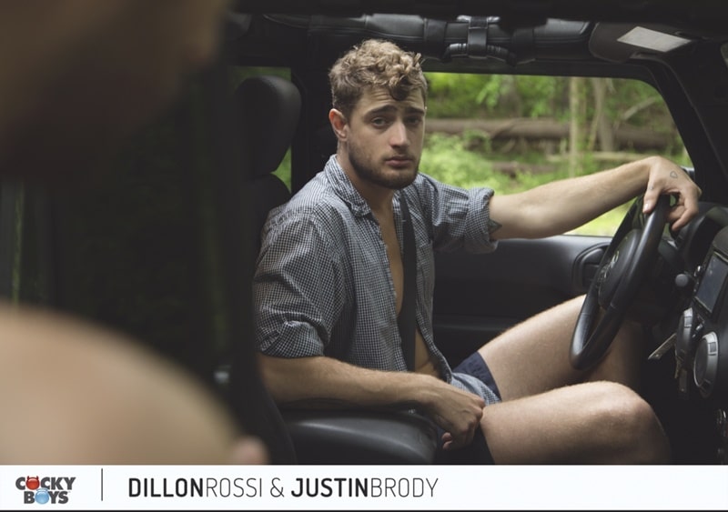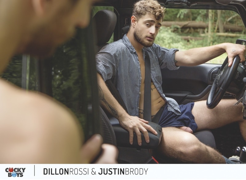 Justin passes by in his wrangler, the two of them checking each other out. Apparently they’ve been cruising each other for quite a while. Dillon starts talking about his fantasy how Justin will pull over, tell him to get in the jeep, and they’ll fuck, right there, in the car and in the woods.