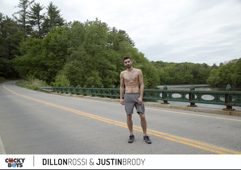 Justin starts deep-throating Dillon’s cock, and as they make out, Justin says how he noticed Dillon cock flopping around in his shorts when ran, saying, “I have a big dick too.” You can tell Dillon is so ready, and he replies, “Oh fuck, I want to feel it inside of me.”