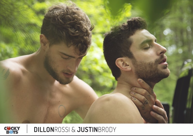 They get out of the car, and first Dillon starts sucking Justin, then Justin flips him around and starts rimming Dillon’s hot ass. Once he’s ready, Justin slips his cock into Dillon’s ass, and they quickly start fucking every which way in the woods Dillon riding Justin’s dick, sliding his ass back and forth on Justin’s rod.
